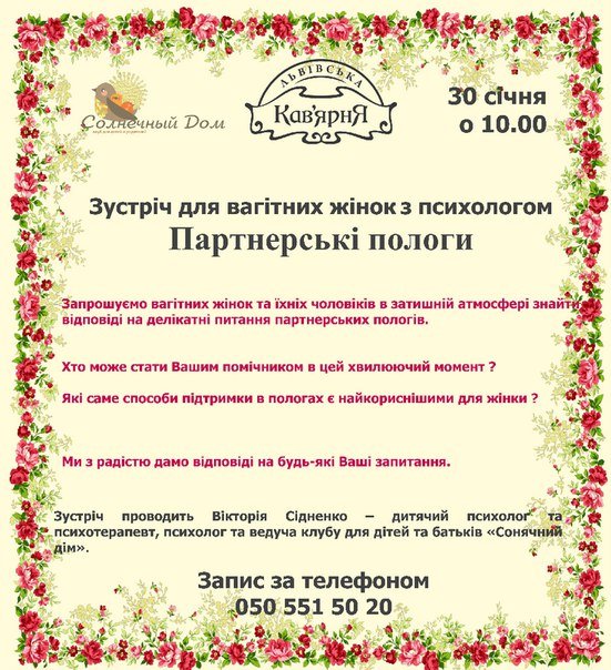 30 січня о 10 годині запрошуємо майбутніх мам і татусів в ЛК на зустріч з психологом Вікторією Сідненко з теми "Партнерські пологи".