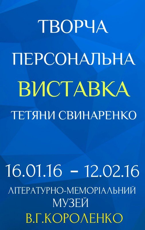 З 16 січня, у приміщенні Літературно - меморіального музею В.Г.Короленка, діє творча персональна виставка Тетяни Свинаренко. Виставка триватиме до 12 лютого.