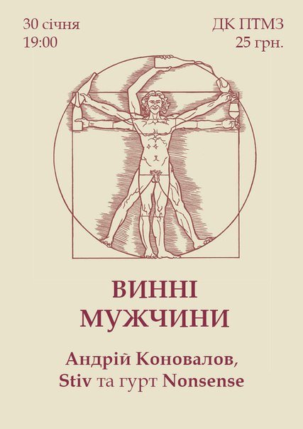 Прекрасного, хоч і морозяного зимового вечору ніщо так не зігріє як мужчина, келих вина і теплі розмови. Ми запрошуємо вас не просто на музично-літературний вечір, а на гаряче рандеву, душевний діалог із присмаком виноградного зілля. Говоритимуть, гратимуть, відкриватимуться цієї миті лише для вас: андрій коновалов, stiv, nonsense.