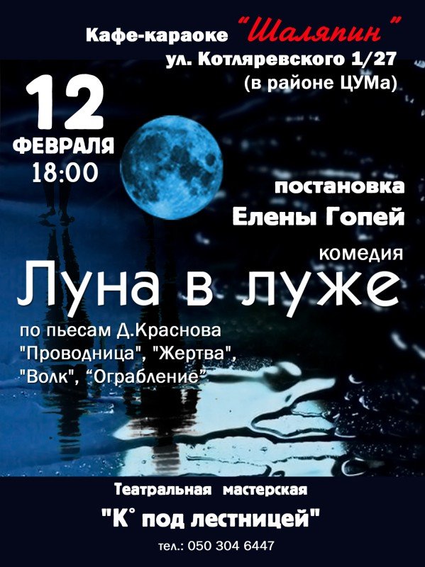 Постановка Елены Гопей «Луна в луже» по пьесам Д.Краснова «Проводница», «Жертва», «Волк». «Театральная Мастерская» в исполнении театральной мастерской «Компания под лестницой».