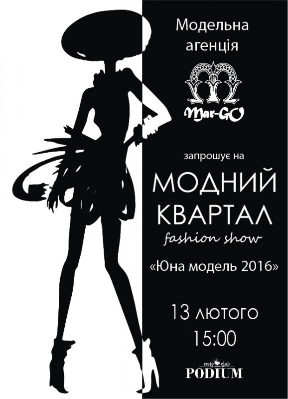 13 лютого 2016 р. Fashion club "Podium" та Модельна агенція "Марго" запрошує полтавців на Fashion show "Mодный квартал" та конкурс "Юна модель 2016".