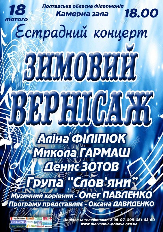 До вашої уваги хіти української естради у виконанні солістів філармонії Дениса Зотова(саксофон), Миколи Гармаша, Аліни Філіпюк та гурту "Слов’яни". Гарний настрій та позитивні емоції гарантовано.