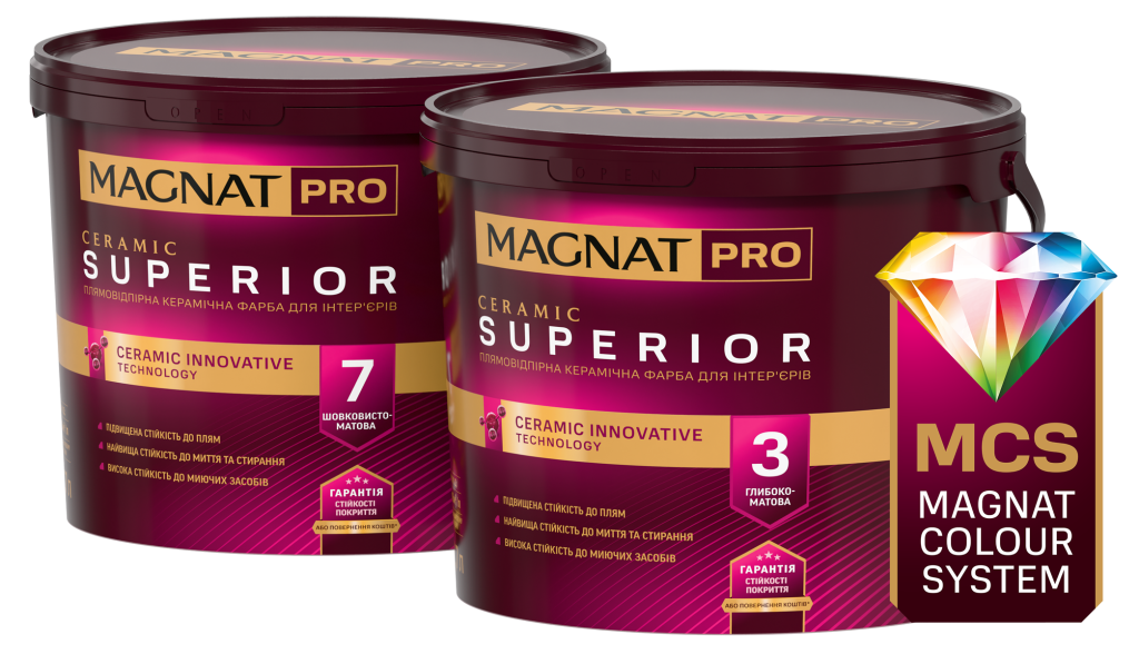 Серія MAGNAT PRO пропонує різноманітні відтінки та фініші, серед яких глибокоматовий та сатиновий. Глибокоматова фарба приховує дрібні нерівності стін і створює спокійний, мінімалістичний вигляд. Сатиновий фініш додає легкого відбиття світла, робить приміщення візуально просторішим і теплішим.
