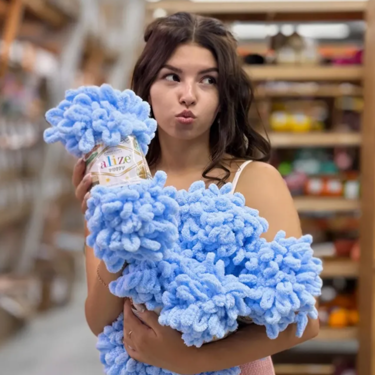 - Для пледів і ковдр — Alize Puffy або Alize Puffy Fine (для ніжніших виробів). Великі петлі дозволяють в'язати руками — без жодних інструментів.