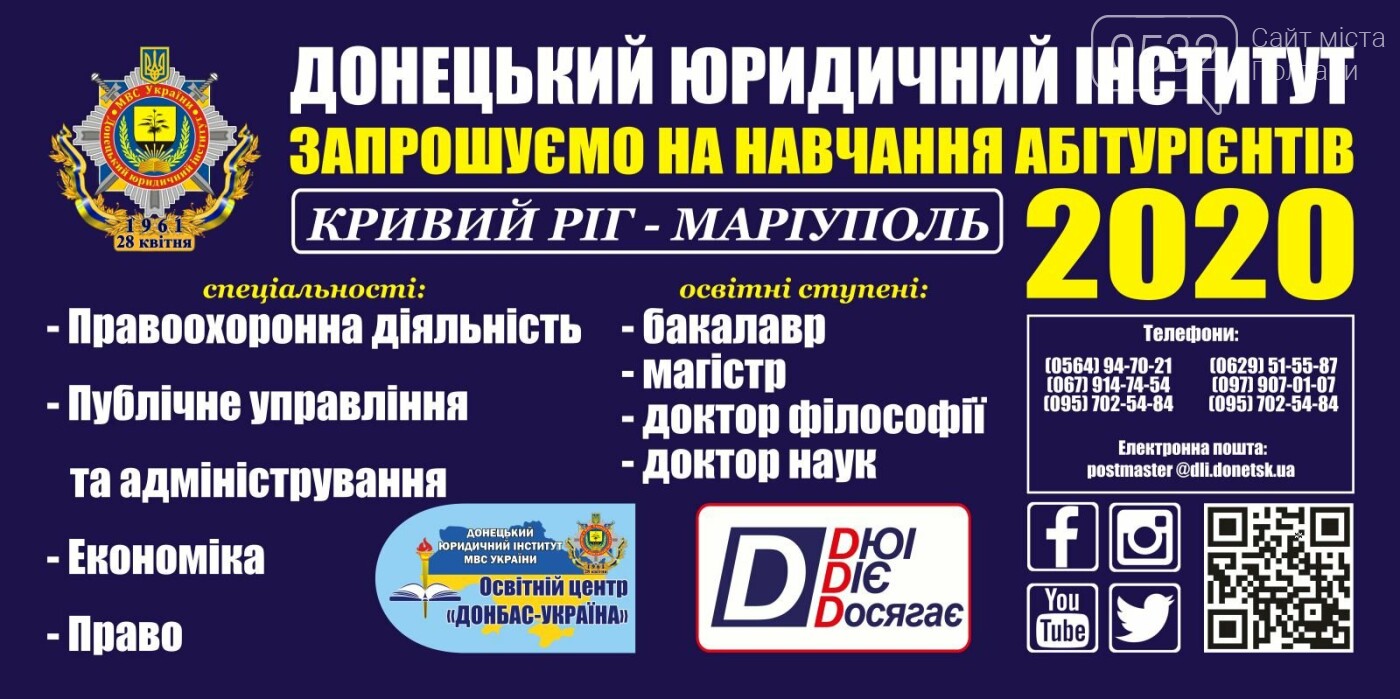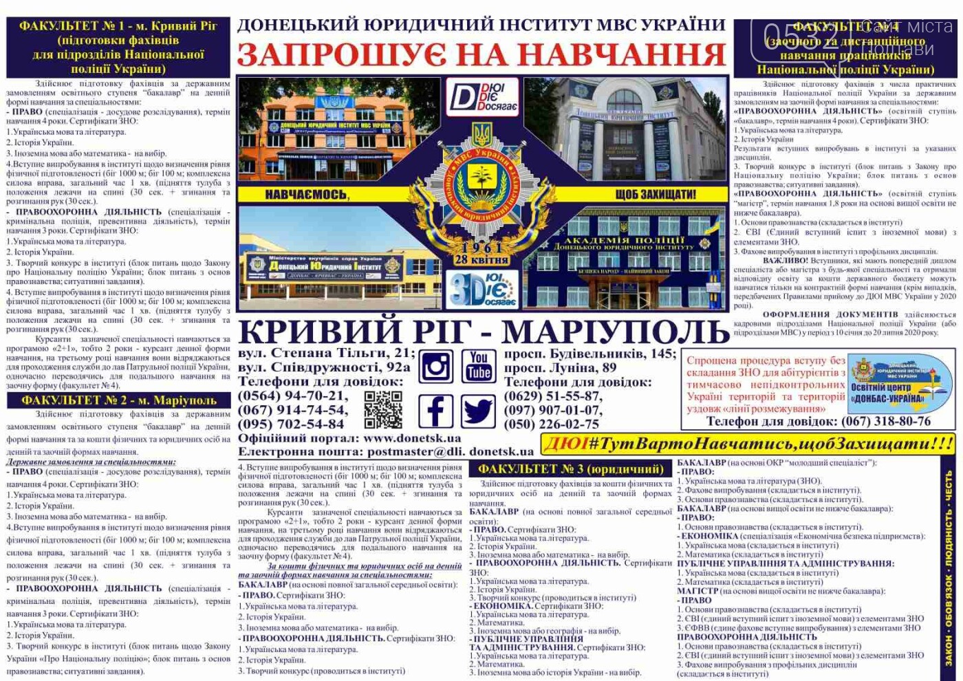 Цьогоріч Донецький юридичний інститут МВС України як заклад вищої освіти відзначає своє 59-річчя на освітніх теренах нашої держави. 28 квітня важлива дата в житті навчального закладу – день його заснування. За роки свого існування завдяки постійному розвитку, впровадженню новітніх технологій підготовки правоохоронців та юристів, розвитку міжнародного співробітництва, науковим, спортивним, культурним досягненням навчальний заклад став справжнім брендом високоякісної освіти. За цей час пройдено непростий, але надзвичайно діяльний і результативний шлях. Шлях, який додав до літопису інституту яскраві, насичені сторінки, продовживши його славну історію від школи міліції до вищого юридичного навчального закладу. Донецький юридичний інститут МВС України – заклад вищої освіти зі специфічними умовами навчання, який 59 років поспіль забезпечує підготовку висококваліфікованих юристів та майбутніх працівників для підрозділів Національної поліції України. Сьогодні ця діяльність відбувається на теренах Криворіжжя та у м. Маріуполі Донецької області.