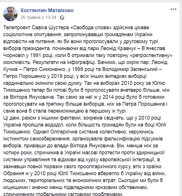 "Обрання 2010 року Юлії Тимошенко вберегло б Україну від війни, людських, територіальних та економічних втрат. Сьогодні ми були б міцнішими та значно менш підвладними кризовим обставинам, спричиненим глобальними світовими проблемами", – написав аналітик на своїй сторінці у Facebook.