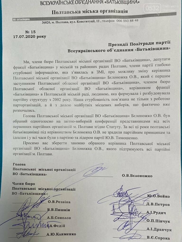 Як нам стало відомо із власних джерел, 17 липня у Полтаві провели засідання політради бюро міської організації партії «Батьківщина». Присутні на засіданні депутати міської та районних рад, члени політради бюро міської партійної організації висловили стурбованість стосовно можливої зміни керівника Полтавської міської організації партії ВО «Батьківщина» Олега Бєлоножка. Нагадаємо, подібна інформація нещодавно з’явилася у полтавських ЗМІ.