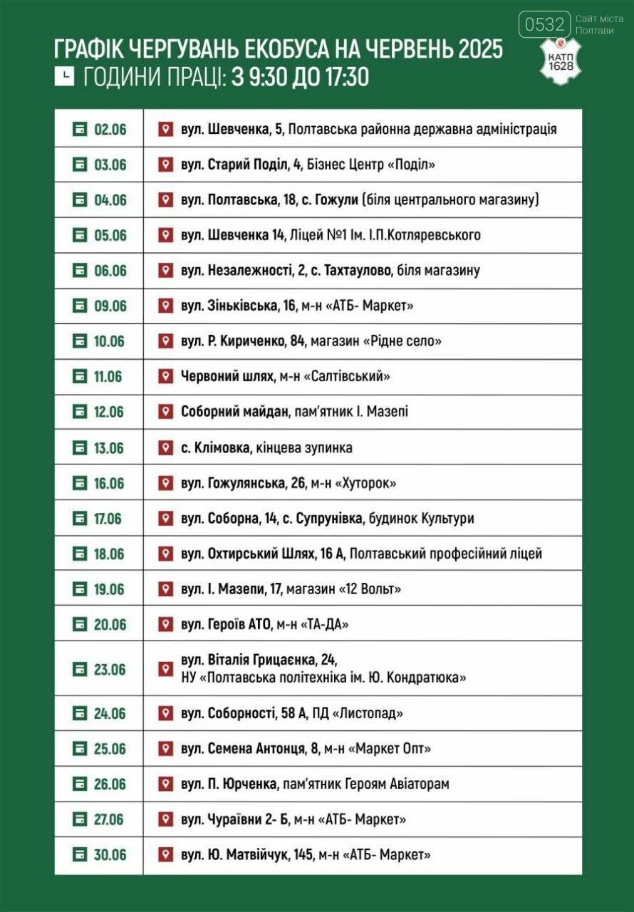 Екобус буде працювати з 09:30 до 17:30 за наступними адресами: