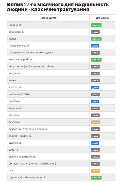 Цей день пов’язують зі стихією води. Вважається корисним перебування біля водойм, купання - за умови, що вода тепла та безпечна. Окрім цього, 27-й місячний день вважають днем знань, які приходять через інтуїцію. Це сприятливий період для медитації, внутрішнього пошуку, отримання нових ідей.