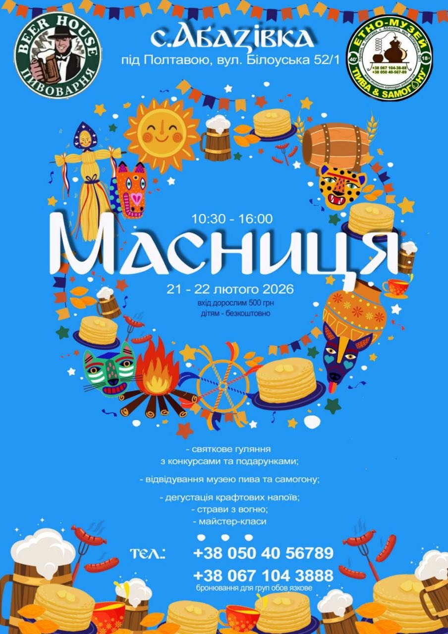 21–22 лютого 2026 року в селі Абазівка відбудеться святкування Масниці. У програмі: народні обряди, розваги, екскурсії до унікального музею та гастрономічні частування. Захід пройде на території ГРК «Алмаз-Плюс» (вул. Білоуська, 52/1).