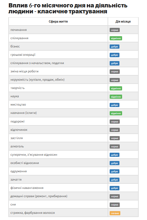 Символ дня — “Гамаюн” — міфічний птах із жіночою головою, який передбачає майбутнє. Шостий місячний день вважається одним із найгармонійніших. Це день любові, споглядання та духовної чутливості. Він сприятливий для наукової й дослідницької роботи, інтелектуальної діяльності та духовних практик.