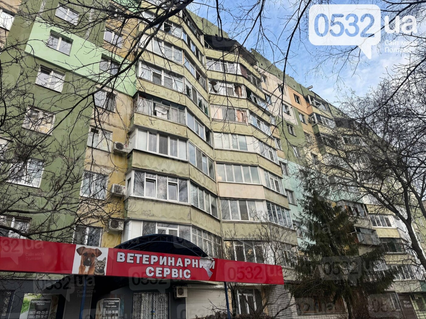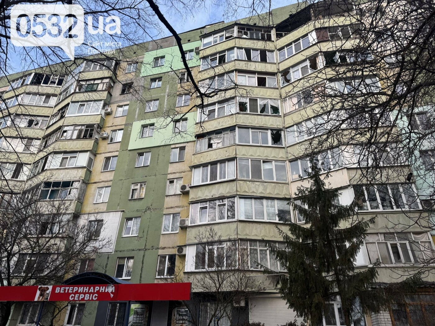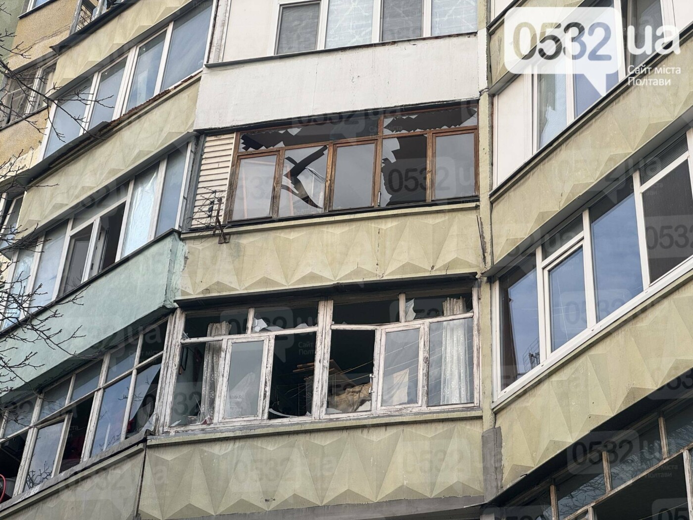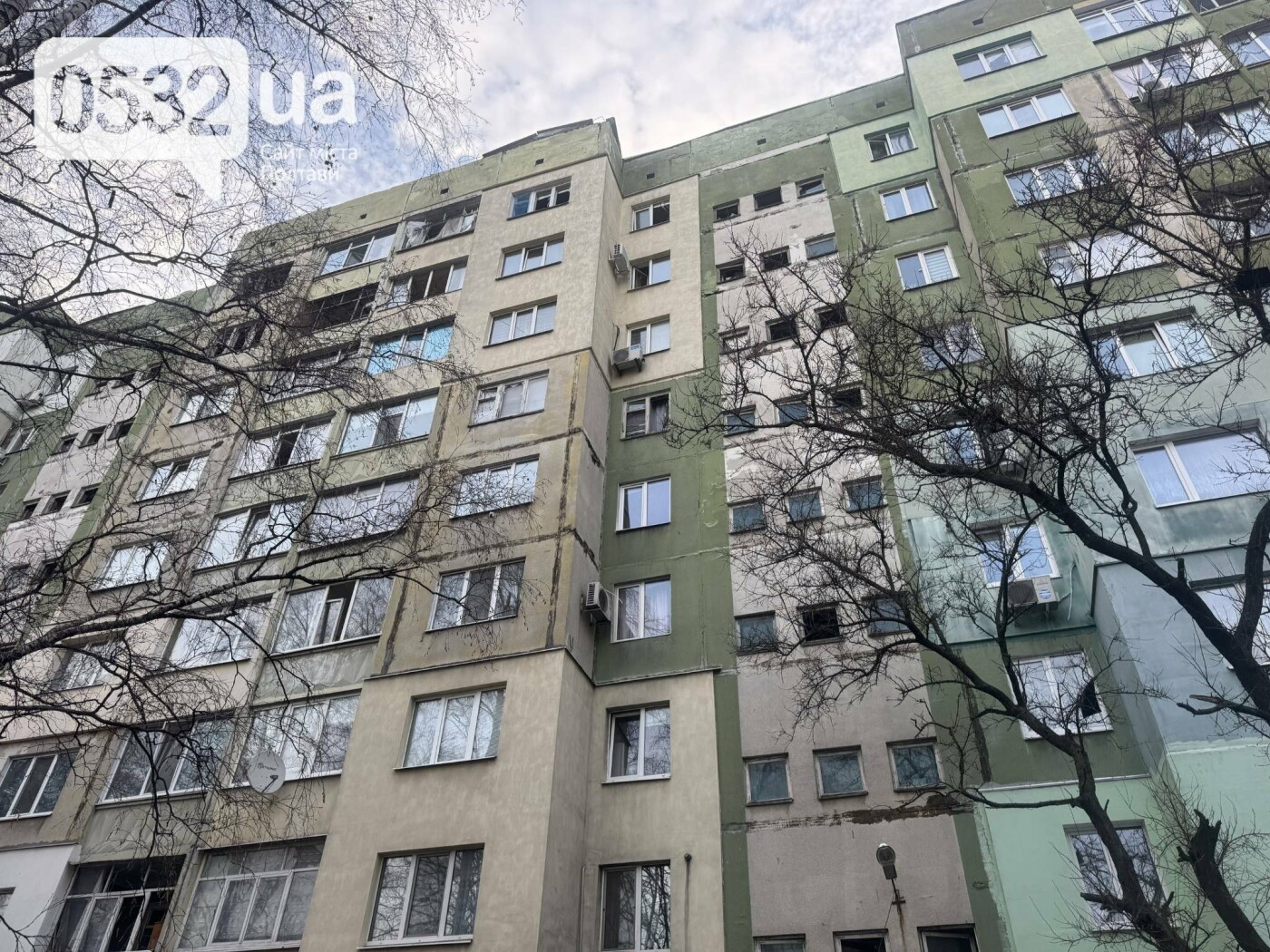 Внаслідок удару зруйновано перекриття дев’ятого поверху багатоквартирного будинку. Також пошкоджено вікна в оселях та припарковані поруч автомобілі.