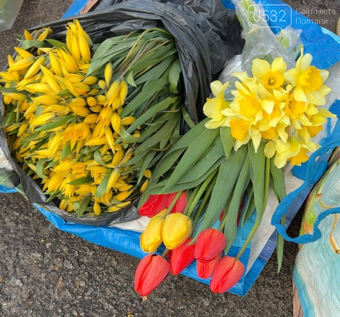 Серед свіжих квітів на Хитрому ринку в Полтаві тюльпани продають по 10 грн за штуку, а нарциси — по 5 грн.