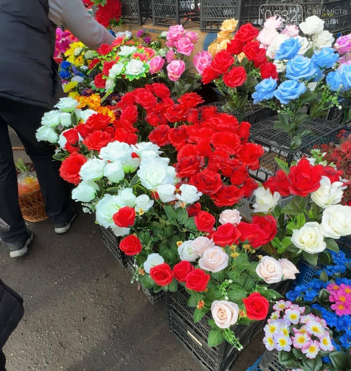 Окрім цього, напередодні поминальних днів на Хитрому ринку в Полтаві також представлені штучні квіти — їх продають за різними цінами: від 15 до 60 грн залежно від розміру та оформлення.