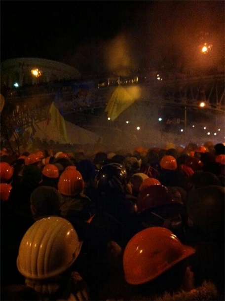 3:43 На Институтской митинугющие сдерживают силовиков, Беркут применяет слезоточивый газ.