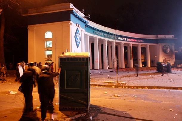Под бой металлических прутов о пустые бочки мобильные группы время от времени выбегают вперед и забрасывают милицию камнями и "коктейлями Молотова". Правоохранители при приближении активистов начинают вести активный огонь резиновыми пулями.