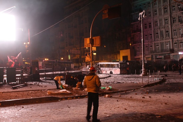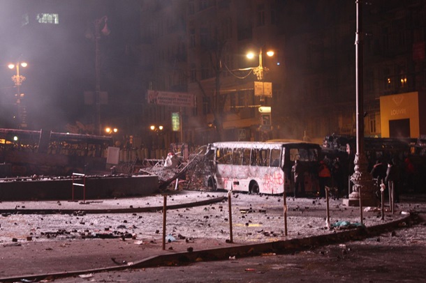 Проезд по улице Грушевского полностью заблокирован сгоревшими автобусами, которые из-за поливания водой примерзли к брусчатке. Проезд по Парковой дороге заблокирован легкими баррикадами. Тротуары во многих местах разобраны протестующими.
