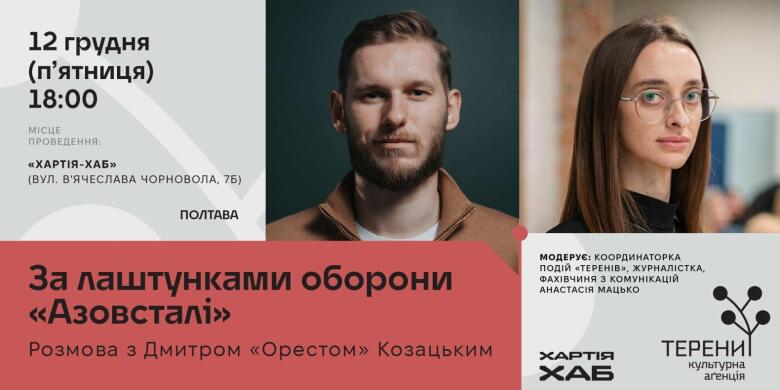 12 грудня о 18:00 культурна аґенція «Терени» організовує показ документальної стрічки «Фортеця Маріуполь. Орест» та зустріч із її головним героєм — Дмитром Козацьким. Про це повідомили організатори. Фільм розповідає про оборону Маріуполя та «Азовсталі», передану через відеодзвінки до українських військових, які опинилися у повному оточенні російських сил. Головний герой стрічки — Дмитро «Орест» Козацький, колишній керівник пресслужби полку «Азов». Він доку...