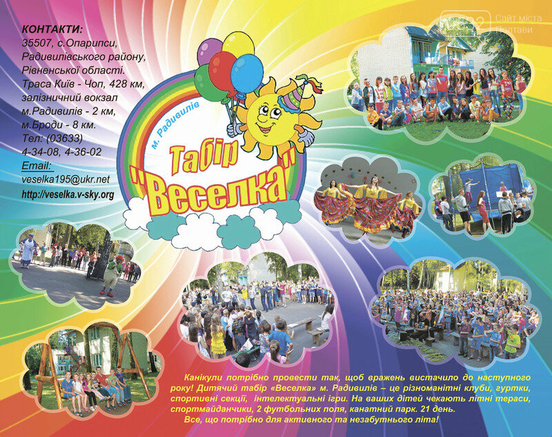 Запрошуємо на відпочинок. Канікули потрібно провести так, щоб вражень вистачило до наступного року! Дитячий табір Веселка м. Радивилів– це різноманітні клуби, гуртки, спортивні секції, інтелектуальні ігри. На ваших дітей чекають літні тераси, спортмайданчики, 2 футбольных поля, канатний парк. Все, що потрібно для активного та незабутнього літа! 14-21 день, 5320-7980 грн.