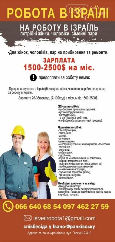 Проводимо набір робітників на роботу в Ізраїль без передоплати за працевлаштування в Україні.